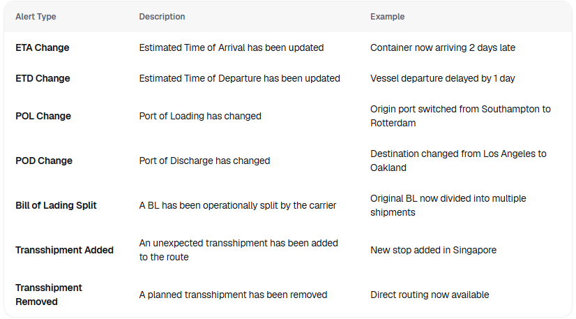 🔴 Critical: Events requiring immediate attention (e.g., significant delays, operational splits) 🟠 Warning: Events that may impact planning but aren't urgent (e.g., minor schedule changes) 🔵 Information: Routine updates for visibility purposes (e.g., port changes, minor route updates)